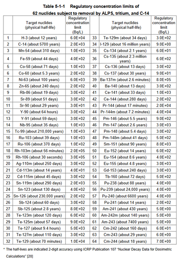 The wastewater is then fed into the ALPS technology, which removes the remaining 60 isotopes from the water after the previous purification step. This means that virtually all isotopes are removed from the water, except for tritium (hydrogen-3) and carbon-14. The licensee (TEPCO) is required not only to reduce the activity concentration of each isotope in the discharged water below the limit for that isotope (see limits in the table in Figure 3) but also to comply with a combined activity concentration limit for the 62 isotopes (in the form of a ratio not described here in details). This should ensure that the ocean, as a natural biological medium receiving the contaminated water, is subjected to limited exposure and that no significant increase in the concentration of radioactive substances in living organisms is expected as a result of the release.