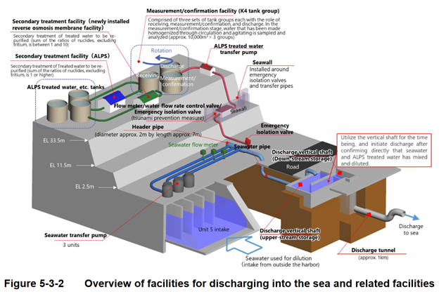 The tank farm is located on the site, above sea level. The water for discharge will be pumped down to sea level, where it will be mixed with seawater taken from the Unit 5 intake shaft, which will then be pumped out through a subsea pipeline via a pipe installed on the seabed, 1 km from the coast. The discharge site is already in an area closed to fishing.