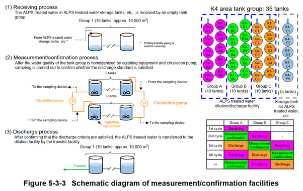 The water treated by ALPS is not completely uniform, its composition depends on the time of origin, the time of treatment, and the properties of the ALPS technology at the time (which has also evolved over time). For this reason, any water mass that is prepared for discharge will undergo further ALPS purification (secondary ALPS treatment) before discharge. To carry out this discharge process, TEPCO will set aside a separate group of tanks, consisting of 3×10 tanks. The operator will rotate between them to carry out the functions to be performed, as illustrated in Figures 4 and 5: