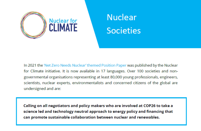 COP26 Position Paper – Net Zero Needs Nuclear Nuclear for Climate is a grassroots initiative gathering nuclear professionals and scientists from over 150 associations with the goal of opening a dialogue with policymakers and the public about the necessity of including nuclear energy among the carbon-free solutions to climate change. The mission is to accelerate…