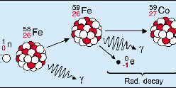 Process to make a material radioactive by bombardment with neutrons, protons or other particles.