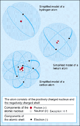 Smallest particle of an elementChemical base material which cannot be chemically converted ... which cannot be chemically divided any further. The elements differ by their atomic structure. Atoms are inconceivably small. A normal drop of water contains about 6,000 quintillion (a 6 with 21 zeros) atoms. The diameter of an atom consisting of a nucleusPositively charged nucleus of an atom. Its diameter amounts ... and orbiting electrons amounts to approx. one hundred millionth of a centimetre (10-8 cm). The nucleusPositively charged nucleus of an atom. Its diameter amounts ... is made up of positively charged protons and electrically neutral neutrons. It therefore has a positive charge. Its diameter amounts to some ten trillionths of a centimetre (1 to 5 · 10-13 cm). The nucleusPositively charged nucleus of an atom. Its diameter amounts ... is therefore 100,000 times smaller than the surrounding sheath of orbiting negatively charged electrons which are as many as the protons in the nucleusPositively charged nucleus of an atom. Its diameter amounts .... Atoms therefore behave electrically neutral to the outside. See ‘nuclide’.