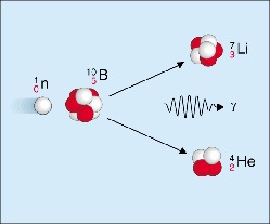Detector, e.g. proportional counterDetection device for ionizing rays. The proportional counter... tube, containing gaseous BF3, used to detect slow neutrons where the alpha particlePositively charged particle emitted by various radioactive m... generated in the chain reactionSelf-perpetuating reaction. In a fission chain reaction, a f... of the neutronUncharged elementary particle with a mass of 1.67492716 ·10... with B-10 serves as proof of neutrons.