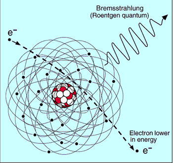 Electromagnetic radiationRadiation from synchro systems and magnetic waves travelling... generated when electrically charged particles are accelerated or decelerated. The spectrum of emitted radiationEnergy dispersion through matter or space. In atomic physics... reaches from a maximum energyAbility to do work or diffuse heat. The unit of energy is th... given by the kinetic energyAbility to do work or diffuse heat. The unit of energy is th... of the generating particle down to zero energyAbility to do work or diffuse heat. The unit of energy is th.... Bremsstrahlung only becomes easily noticeable when the energyAbility to do work or diffuse heat. The unit of energy is th... of the particle is very high compared to its self-energy. This is mostly only valid for electrons (rest-energy of the electronElementary particle with a negative electrical elementary ch...: 511 keVKiloelectron volt; 1 keV = 1,000 eV; See 'Electron volt'.).