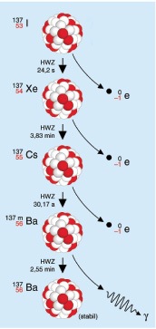 Parent / daughter / grandchild nuclides in the decayThe spontaneous conversion of a nuclide into another nuclide... chain of iodine-137 to barium-137