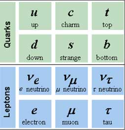 The multitude of such „elementary particles“ – in addition to those listed in the table, a further 200 were found – led to the „invention“ and eventually to the discovery of the „quarks“ and subsequently to today’s „standard model“ of elementary particles. This standard model consists of twelve parts – see figure – and the same number of antiparticles. Thus, the proton consists of two „up-quarks“ and one „down-quark“, the neutron of one „up“ and two „downs“, where the up-quark has a charge of +2/3 and the down-quark -1/3 electric elementary charges to meet the electric charge conditions.
