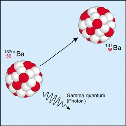 EmissionThe discharge (e.g. solid, liquid or gaseous substances, sou... of a gamma quantumEnergy quantum of short-wave electromagnetic radiation. (gamma radiationHighly-energetic, short-wave electromagnetic radiation emitt..., y-radiation) from an excited atomic nucleusPositively charged nucleus of an atom. Its diameter amounts ...