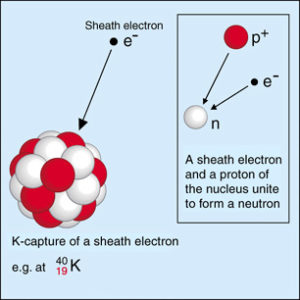 Capture of an orbiting electronElementary particle with a negative electrical elementary ch... from the nuclear shell by an atomic nucleusPositively charged nucleus of an atom. Its diameter amounts .... See ‘electron captureDisintegration type of some radionuclides, e.g. K-40, Mn-54,... ‘.