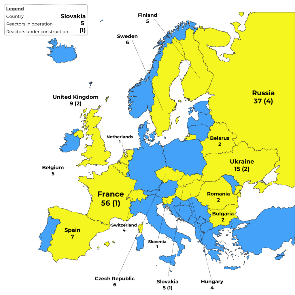 As of October 2025, there is a total of 165 nuclear power reactors with an installed electric net capacity of 147,997 MWeMegawatt electric; electric output of a power plant in megaw... in operation in Europe (six thereof in the Asian part of the Russian Federation), and 9 units with an electric net capacity of 9,969 MWeMegawatt electric; electric output of a power plant in megaw... were under construction in four countries.