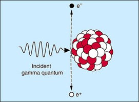 Interaction of energy-rich electromagnetic radiation with matter. If the energy of a radiation is greater than 1.02 MeV and thus greater than double the rest mass of an electron (me,0= 0.511 MeV), it is possible to generate an electron-positron pair (materialisation of energy).