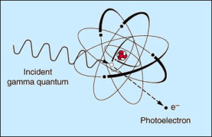 InteractionInfluence of a physical body on another body or the coupling... of roentgenFormer unit of ion dose, symbol: R. The ion dose of 1 roentg... and gamma radiationHighly-energetic, short-wave electromagnetic radiation emitt... with matter. The roentgenFormer unit of ion dose, symbol: R. The ion dose of 1 roentg... or gamma quantumEnergy quantum of short-wave electromagnetic radiation. transfers its energyAbility to do work or diffuse heat. The unit of energy is th... to the shell electronElementary particle with a negative electrical elementary ch... of the atomSmallest particle of an element which cannot be chemically d.... The electronElementary particle with a negative electrical elementary ch... receives kinetic energyAbility to do work or diffuse heat. The unit of energy is th... which is equal to the energyAbility to do work or diffuse heat. The unit of energy is th... of the quantum reduced by the binding energyThe energy required to separate particles which are bound by... of the electronElementary particle with a negative electrical elementary ch....