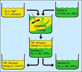 Principle of the PUREXPlutonium and Uranium Recovery by Extraction. (See 'PUREX pr... process for the separation of uraniumNatural radioactive element with the atomic number 92. The n... and plutoniumPlutonium - the 94th element in the classification of elemen... from fission productsNuclides generated by fission or subsequent radioactive deca...