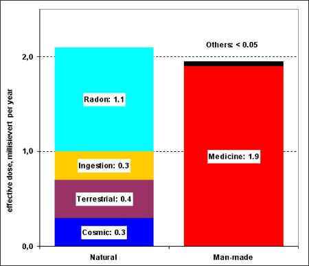 The effective doseMeasure of a radiation effect to be indicated more precisely... from all natural and artificial radiationEnergy dispersion through matter or space. In atomic physics... sources amounts for inhabitants in Germany to an average of 3.9 millisievert per year. Natural radiationEnergy dispersion through matter or space. In atomic physics... exposure and medical exposure, particularly x-ray diagnostics, contribute each nearly half of the total doseMeasure of a radiation effect to be indicated more precisely.... Compared to the radiationEnergy dispersion through matter or space. In atomic physics... doseMeasure of a radiation effect to be indicated more precisely... from nature and medicine and above all considering the considerable variation of these doseMeasure of a radiation effect to be indicated more precisely... values, all other doseMeasure of a radiation effect to be indicated more precisely... contributions are actually negligible.