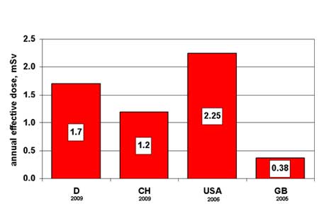 The average effective doseMeasure of a radiation effect to be indicated more precisely... of the population in Germany due to medical application of ionising rays and radioactive substancesRadioactive substances within the meaning of the Atomic Ener... amounts to 1.8 mSv per year. X-ray diagnostics make up the largest part of civilisation-related radiationEnergy dispersion through matter or space. In atomic physics... exposure of the population in Germany. The frequency of x-ray examinations in Germany amounts to 1.6 examinations per caput per year and the effective doseMeasure of a radiation effect to be indicated more precisely... amounts to 1.7 mSv/a. Although there is a declining trend in some x-ray examinations, which can be explained by the growing use of alternative examination procedures, there is an increase in modern dose-intensive examinations such as computer tomography. Nuclear medicineApplication of open or enclosed radioactive substances in me... in Germany contributes about 0.1 mSv per caput per year, considerably less to radiationEnergy dispersion through matter or space. In atomic physics... exposure of the population because of the lower application frequency compared to x-ray diagnostics and the partly lower effective doseMeasure of a radiation effect to be indicated more precisely... per examination.