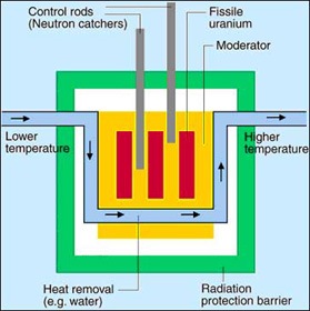 System used to initiate, maintain and control a fissionSee 'nuclear fission'. chain reactionSelf-perpetuating reaction. In a fission chain reaction, a f... (chain reactionSelf-perpetuating reaction. In a fission chain reaction, a f...). The main part is a corePart of the nuclear reactor where the fission chain reaction... with fissile nuclear fuelIn accordance with the definition of the German Atomic Energ.... In general, a reactor is equipped with a moderatorMaterial used to "decelerate" fast neutrons to low energies,..., a shield and control devices. Reactors are built for research or power generation purposes. Reactors where the chain reactionSelf-perpetuating reaction. In a fission chain reaction, a f... is maintained by thermal neutrons (see neutrons, thermalNeutrons in thermal equilibrium with the ambient medium. The...) are called thermal reactors; if the chain reactionSelf-perpetuating reaction. In a fission chain reaction, a f... is maintained by fast neutrons, one refers to fast reactors. The first reactor was put into operation on 2nd December 1942 by a group of researchers headed by Enrico Fermi. (See pressurized water reactorPower reactor in which the heat is dissipated from the core ..., boiling water reactorNuclear reactor with water as a coolant and as a moderator, ...).