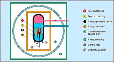 The safe enclosure of the radioactive inventory of a nuclear facilityFor the application of liability regulations, the Atomic Ene... is effected according to the multiple barrierThe safe enclosure of the radioactive inventory of a nuclear... principle, i.e., to release radioactive substancesRadioactive substances within the meaning of the Atomic Ener..., these must pass different barriers connected in series. The barriers of a nuclear reactorSee 'reactor'. are e.g.:
