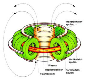 Experimental arrangement for controlled nuclear fusionSee 'fusion'.. In a Tokamak, two superimposed magnetic fields enclose the plasmaElectrically neutral gas mixture of ions, electrons and neut...: this is the toroidal field generated by external coils on the one hand and the field of a flow in the plasmaElectrically neutral gas mixture of ions, electrons and neut... on the other hand. In the combined field, the field lines run helicoidally around the torus centre. In this way, the necessary twisting of the field lines and the structure of the magnetic areas are achieved. Apart from the toroidal field generated by the external field coils and the field generated by the flow in the plasmaElectrically neutral gas mixture of ions, electrons and neut..., the Tokamak requires a third vertical field (poloidal field), fixing the position of the flow in the plasmaElectrically neutral gas mixture of ions, electrons and neut... container. The flow in the plasmaElectrically neutral gas mixture of ions, electrons and neut... is mainly used to generate the enclosing magnetic field. In addition, it provides effective initial heating of the plasmaElectrically neutral gas mixture of ions, electrons and neut.... The flow in the plasmaElectrically neutral gas mixture of ions, electrons and neut... is normally induced by a transformer coil. Owing to the transformer, the Tokamak does not work continuously, but in pulse mode. Since, however, a power plant should not be operated in pulse mode for technical reasons, methods are examined to generate a continuous flow – for example by high-frequency waves. The fusionFormation of a heavy nucleus from lighter nuclei releasing e... research plant JETJoint European Torus; large-scale experiment for controlled ... is built according to the Tokamak principle. The fusionFormation of a heavy nucleus from lighter nuclei releasing e... reactorSystem used to initiate, maintain and control a fission chai... ITERThe major international fusion programmes – People’s R... is also planned according to this principle.