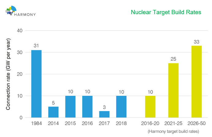 The Harmony goal is to build 1000 GWe of new nuclear capacity by 2050. It is an ambitious programme, but the rate at which new reactors will have to be built is no higher than what has been historically achieved (World Nuclear Association)