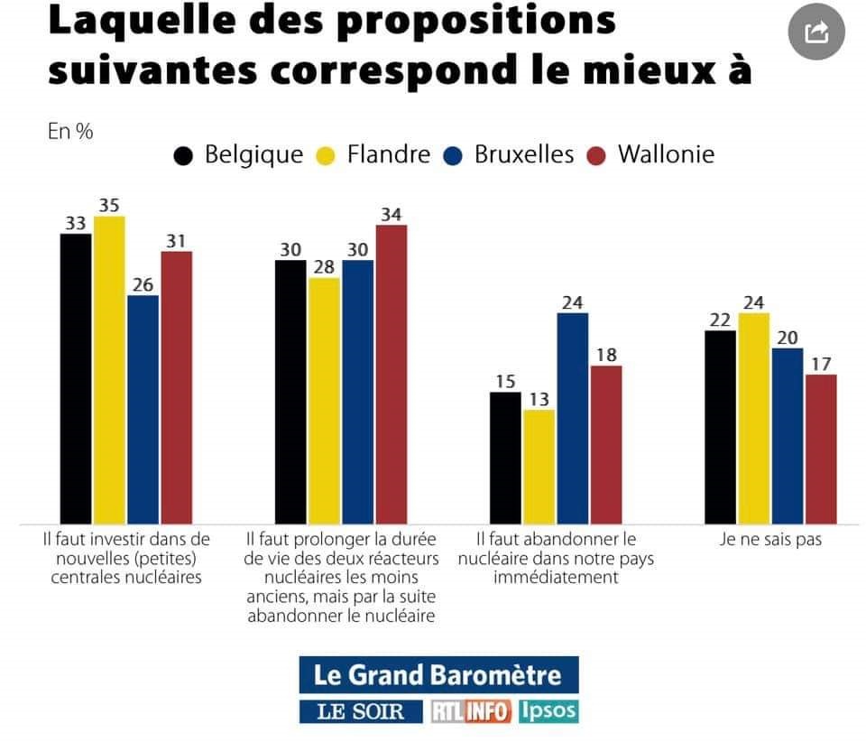 Only 15% of respondents support the immediate nuclear phaseout, with a peak of 24% in the Brussels Region.