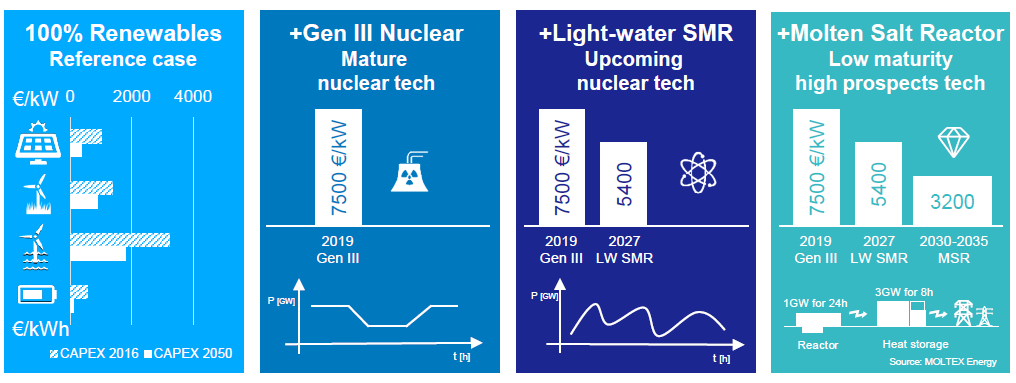 The other strength of SMRs lies in their enhanced load-balancing capabilities, and for some advanced technologies even GWh-scale energy storage, that are ideal to complement the intermittency of renewables. Our power market simulation studies have even shown that dispatchable nuclear electricity has a positive impact on the profitability of renewables when they occupy the most important share of the electricity mix: simply because it decreases the need for investments in expensive storage capacity and transmission lines.